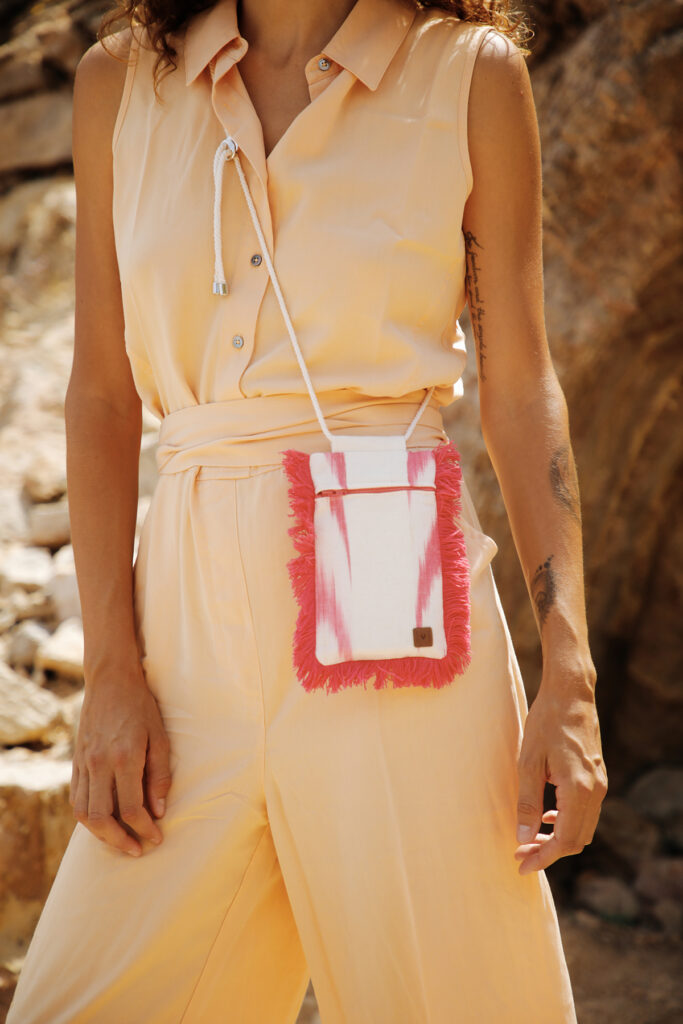Fringe mobile phone holder Mallorcan fabric ikat 61 Pink fuchsia